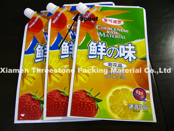 Feautre:1) colorful printing are available, up to 8 spot color, gravure printing; 2) smell proof, to keep food fresh; 3) bottom gusset, free standing; 4) with spout fill liquid in, 5) spout can be customize to fit different machine