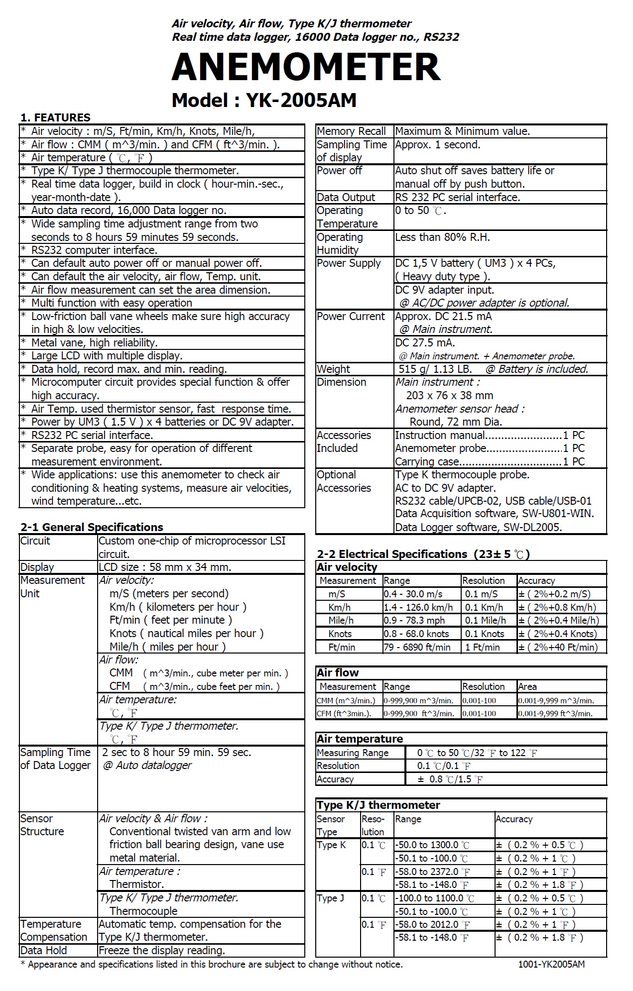 ANEMOMETER - YK-2005AM   記憶式風速/風量/溫度計