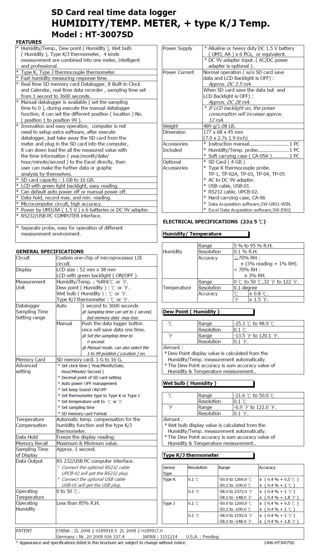 HUMIDITY/TEMP. METER  Model : HT-3007SD   記憶式溫溼度/溫度計