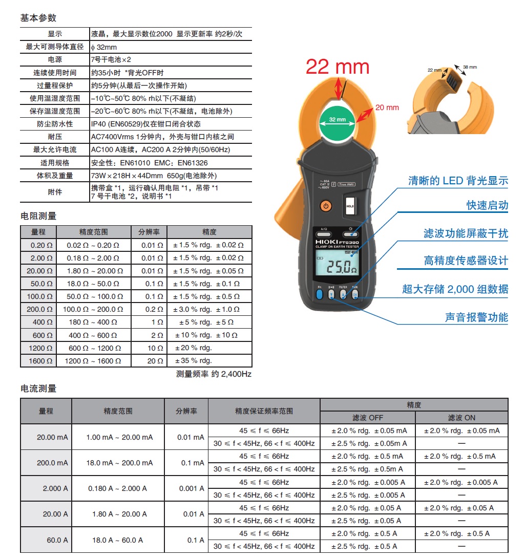 接地电阻测量 0.20Ω(分辨率0.01Ω) ~1600Ω(分辨率20Ω), 10档量程,0.02Ω以下消零,