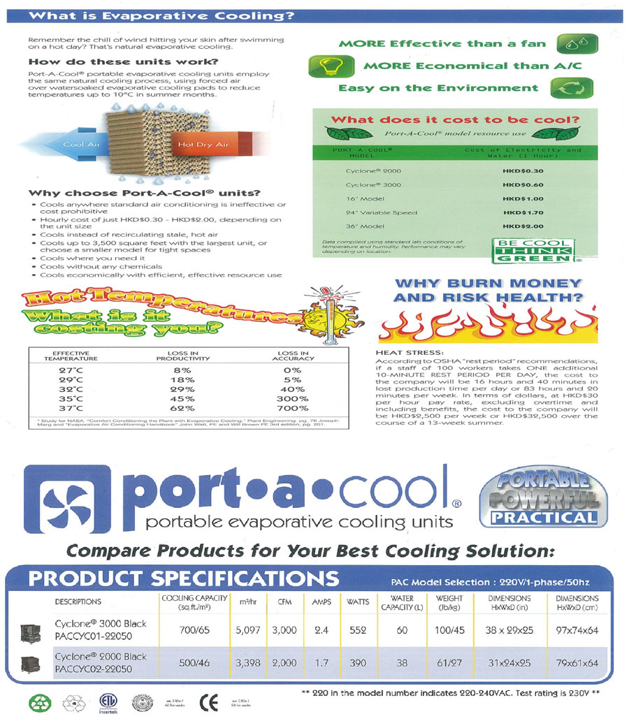 隨著氣候變化,香港炎熱的日子愈來愈多,長時間處於高溫天氣下,容易中暑或熱衰竭,危害健康。傳統空調耗電量大,在酷熱天氣警告下,某些空氣不太流通的地方,如貨倉、地下停車場等,更為悶熱難耐,所使用的冷凍劑又會嚴重破壞環境,亦難以應用於戶外場所。因此,好環境工程服務有限公司從美國引入Port-A-Cool®系列冷風機,此冷風機主要是透過蒸發,利用水流吸收空氣中的熱能,輸送出涼風,令周遭溫度下降,省電又環保。