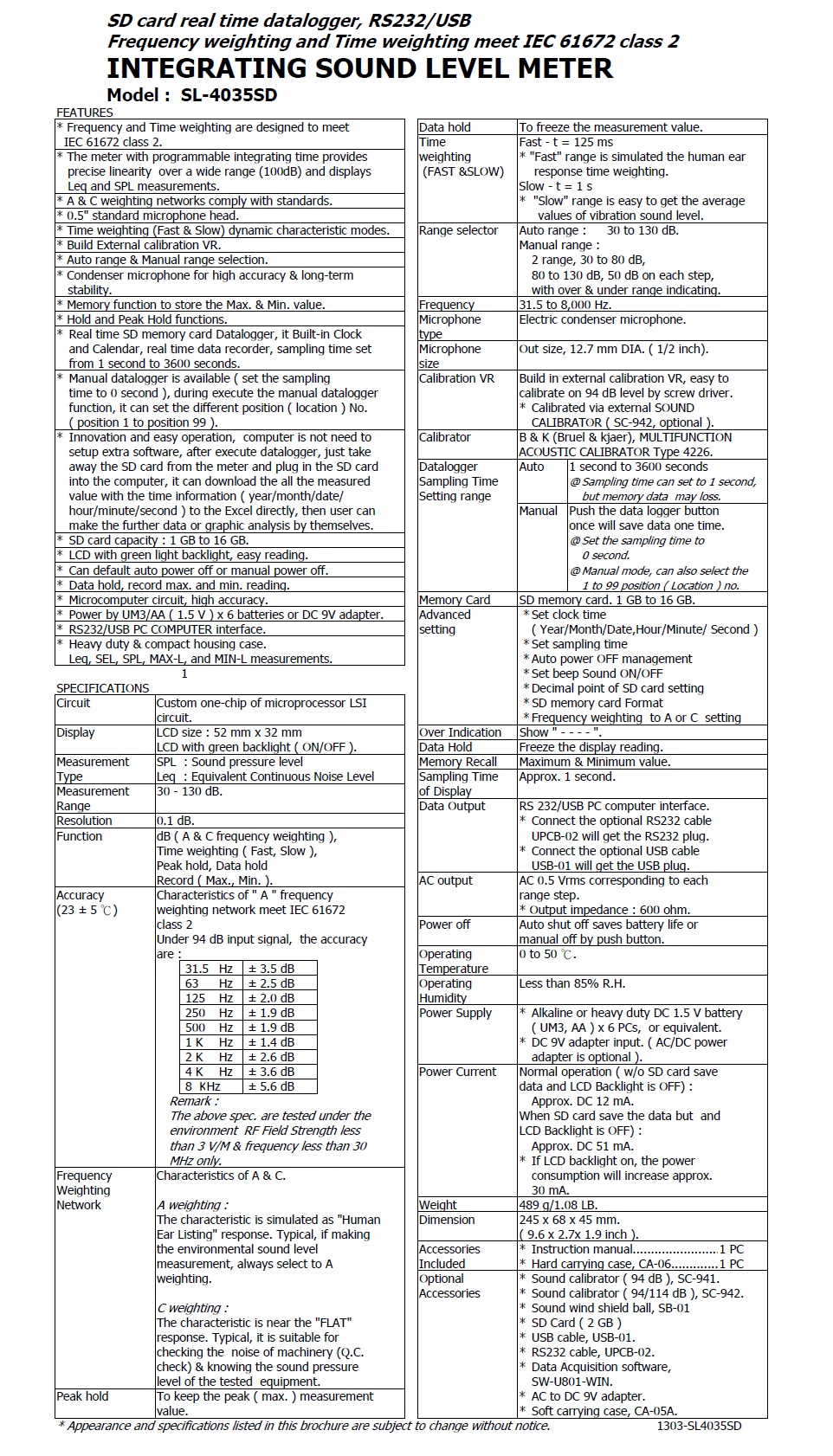 Product Name : | INTEGRATING SOUND LEVEL METER Model : SL-4035SD 記憶式積分噪音計 |