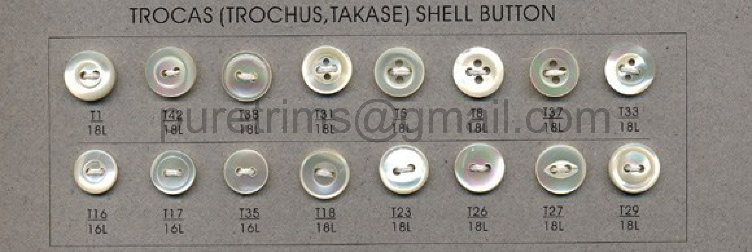 We specialize in making shell buttons, such as Mother of Pearl, Trocas, Agoya, Rivershell, Abalone and etc.  Can be DTM.