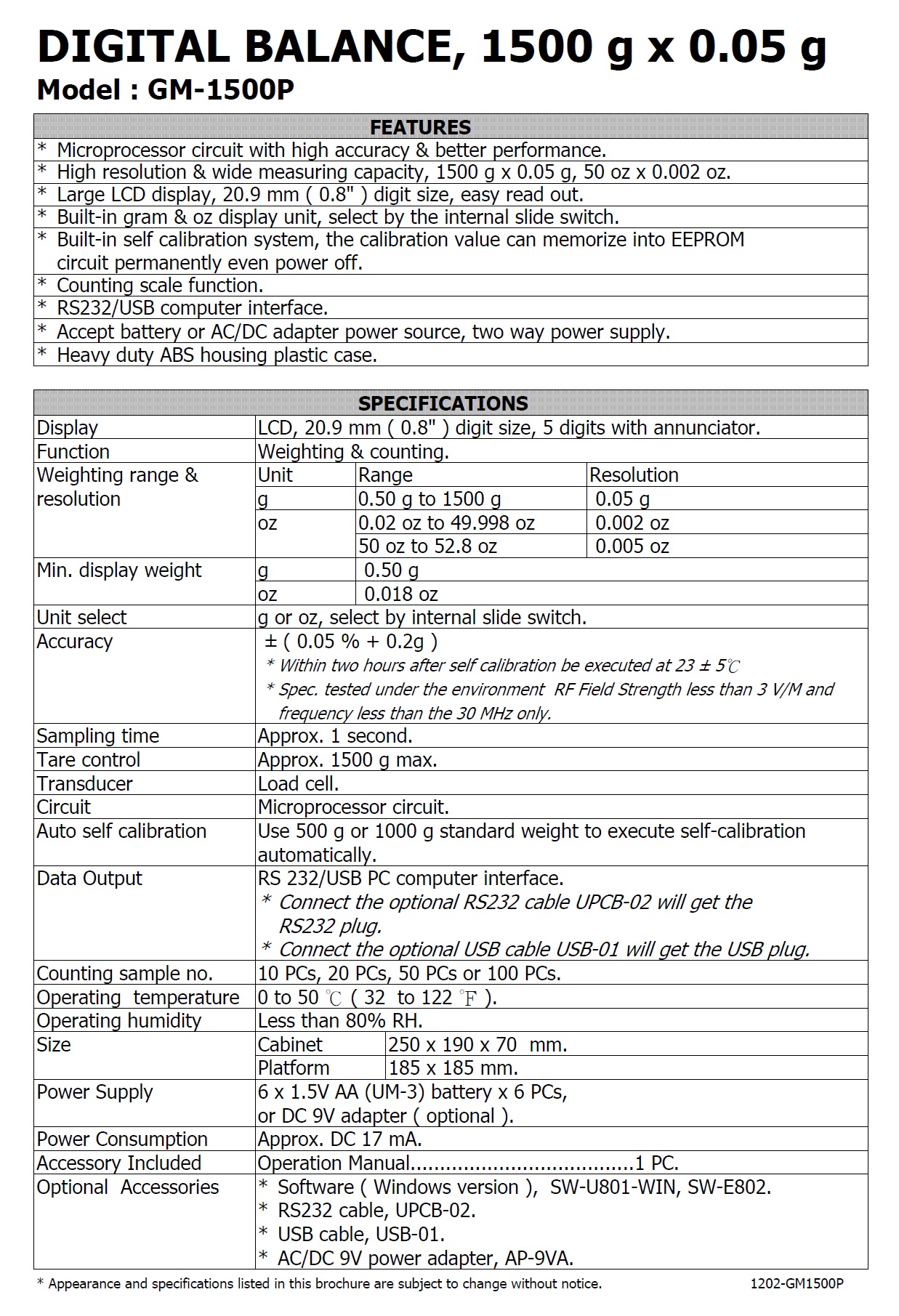 Model : GM-1500P 精密型磅秤