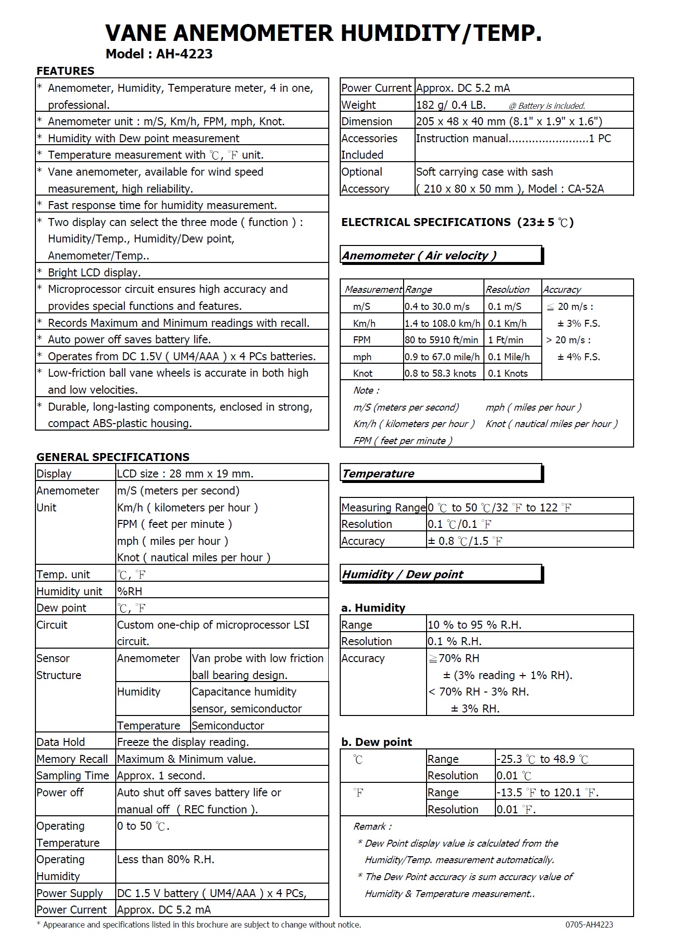 Product Name : | VANE ANEMOMETER - AH-4223 葉片風速計, 溫濕度計 |