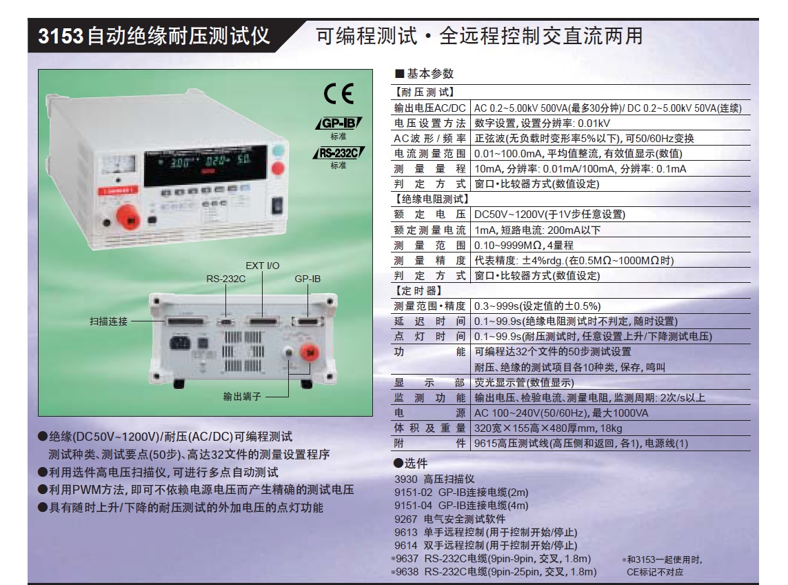 绝缘电阻测试(DC50V~1200V),耐压测试(AC/DC5000V),全远程控制