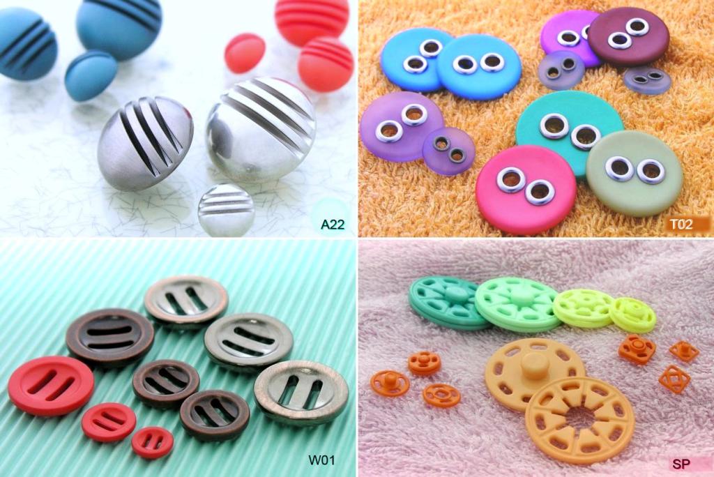 sew-on button . four holes and two holes nylon button . ribbon button . rubber button . 2 parts snap button . prong snap button . combination button . plastic snap button . ring . horn button . stopper . bell end . cord end . buckle . eyelet . washer . pig's nose card . underwear buckle . jean button . velcro