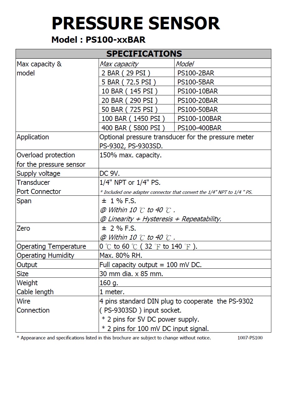 * PS100-5BAR : 5 bar sensor.