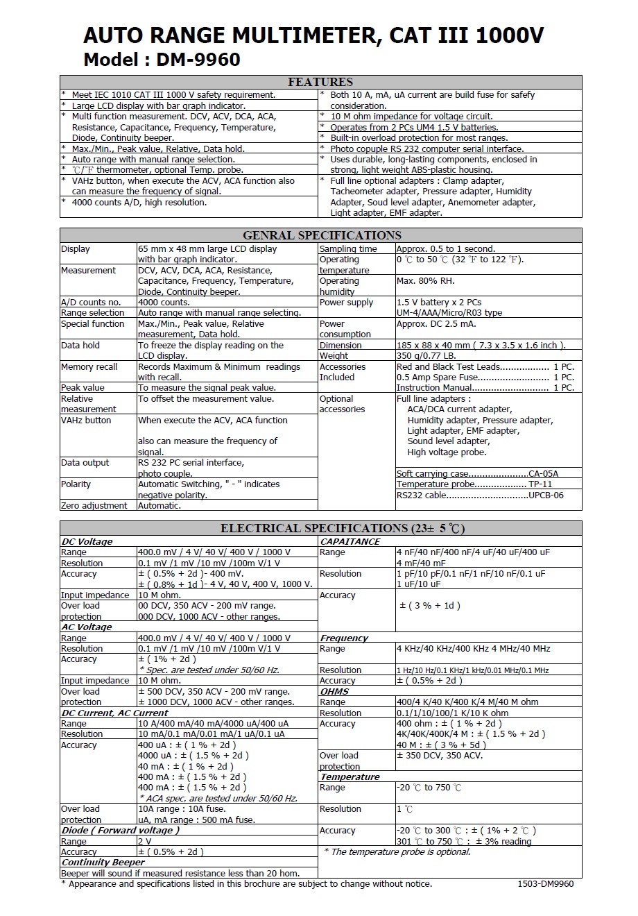 Product Name : AUTO RANGE MULTIMETER, CAT III 1000V Model : DM-9960 智慧型自動換檔電錶