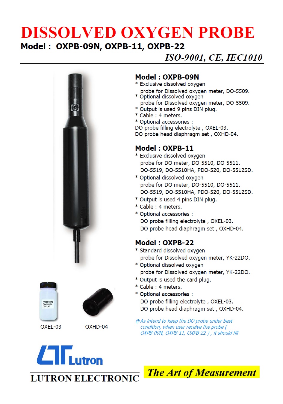 Product Name : DISSOLVED OXYGEN PROBE Model : OXPB-09N, OXPB-11, OXPB-22 溶氧探頭