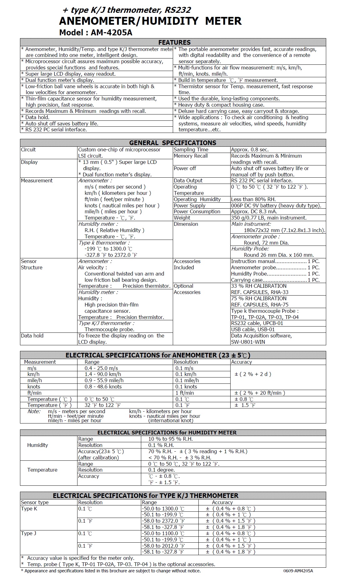 HUMIDITY/ANEMOMETER METER, + type K/J